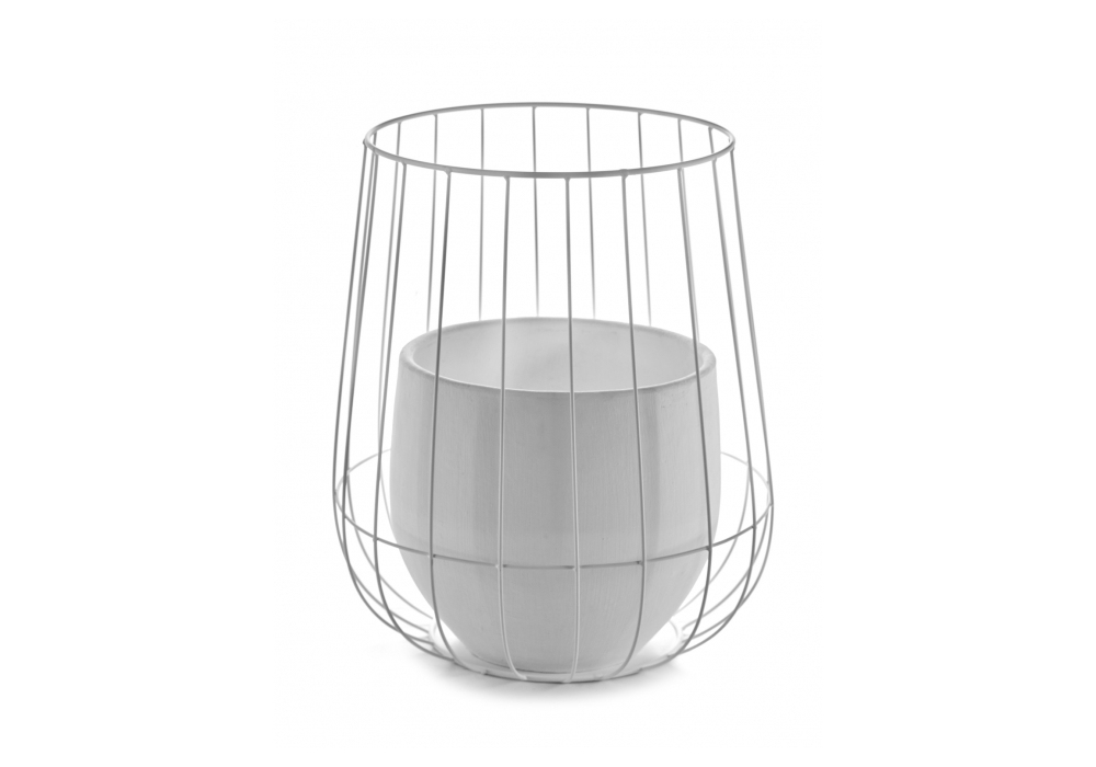 Pot in a Cage diseñado por Marie Michielssen para Serax es un jarrón, estructurado por una jaula de metal, que alberga un cilindro de terracota acampanado en su interior. Pot in a Cage está disponible en blanco, negro o verde.