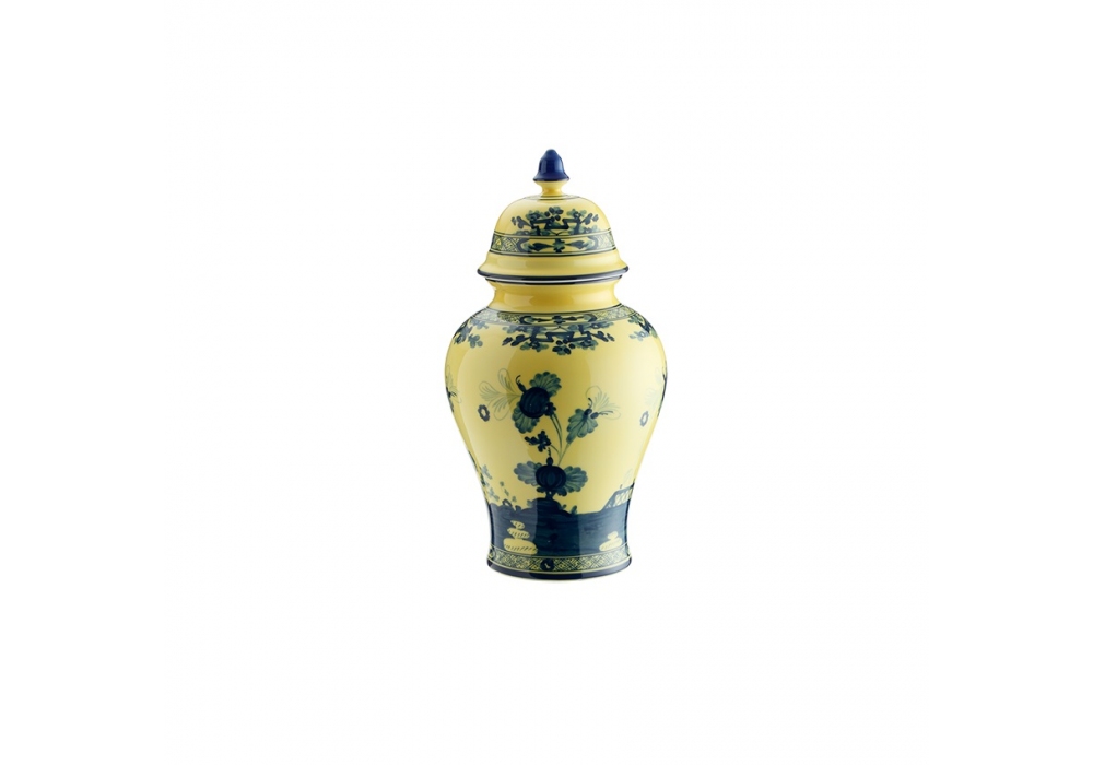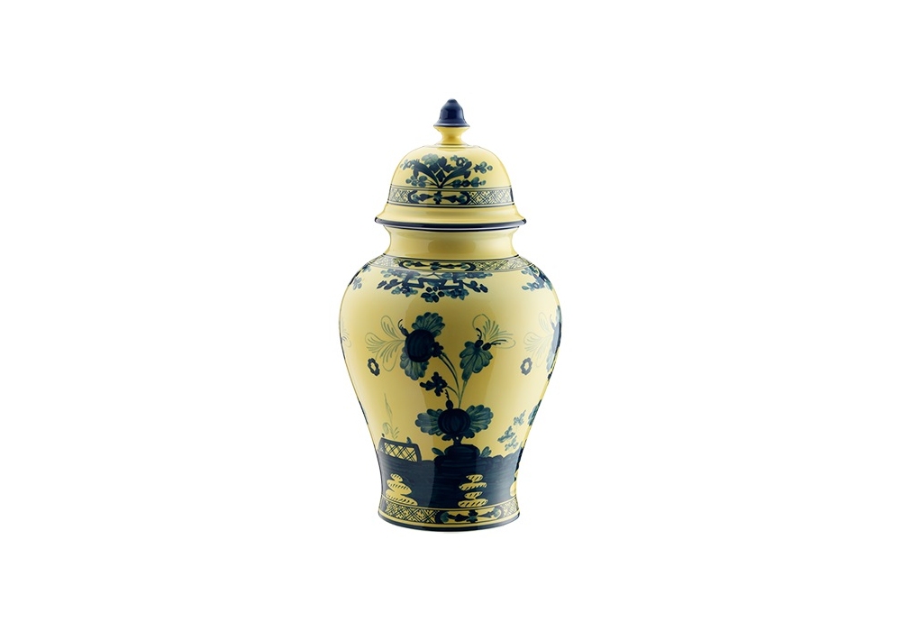 Potiche con Coperchio Oriente Italiano Citrino diseñado por Ginori 1735 es un jarrón decorado con tapa. Disponible en 2 medidas.