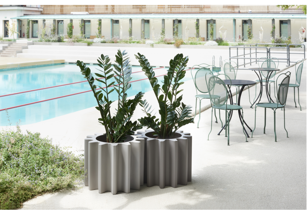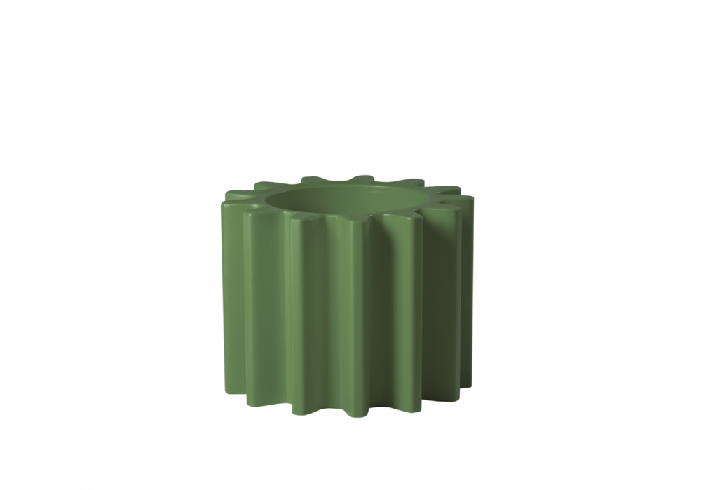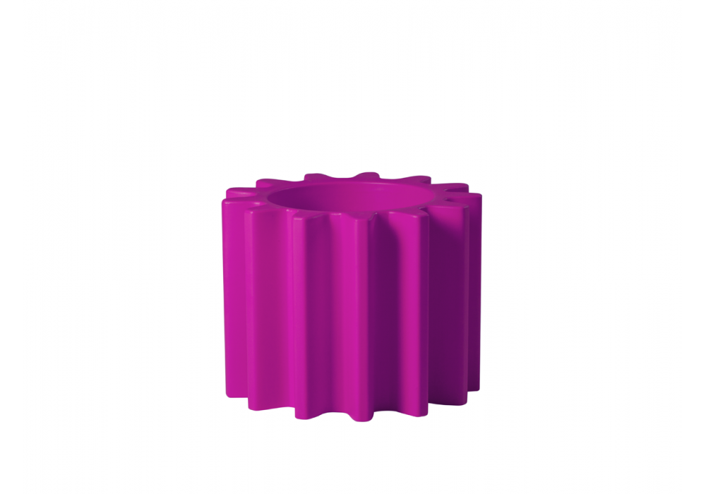 Gear Pot diseñado por Anastasia Ivanyuk para Slide es un jarrón que se inspira en la forma típica de los engranajes mecánicos y se puede utilizar como jarrón, gracias a la doble pared interna, y como asiento. Disponible en diferentes acabados