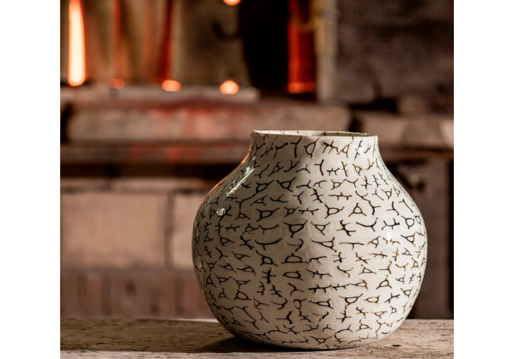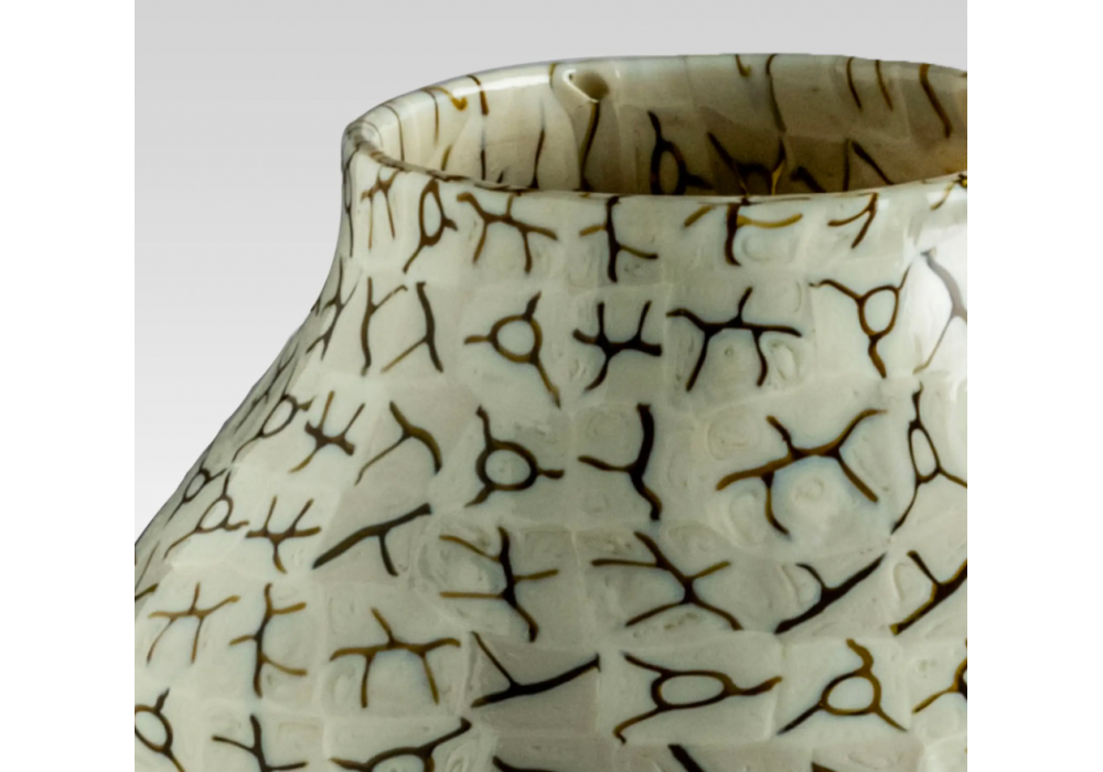 Coccio diseñado y producido por Venini es un jarrón de vidrio soplado decorado con la técnica murrine, en color marfil/té.