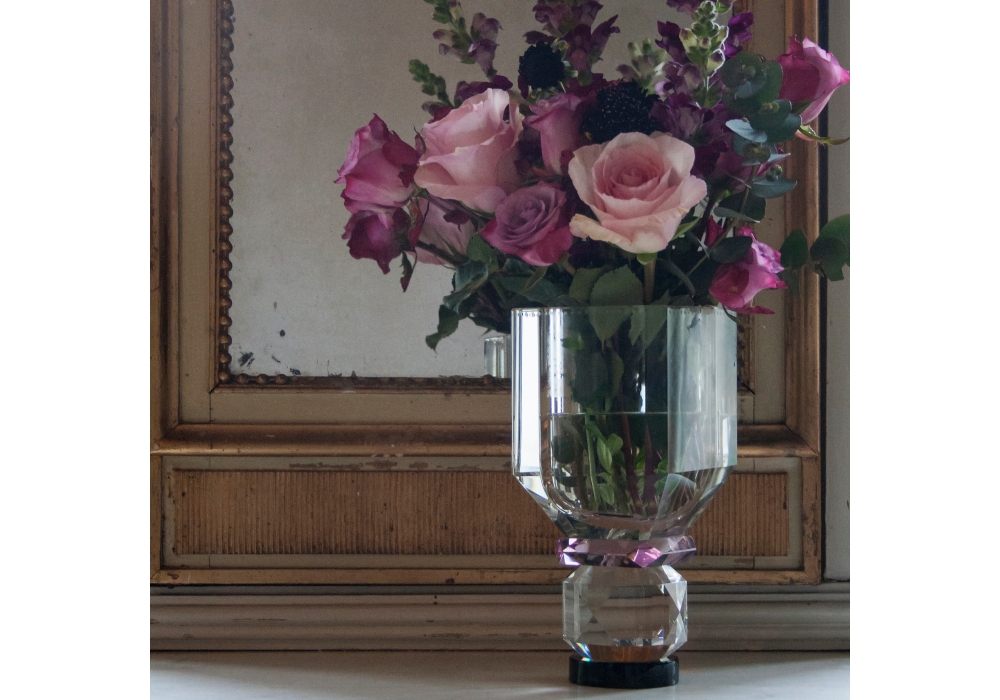 Utah producido y firmado por Reflections Copenhagen es un jarrón de cristal cuadrangular estructurado por varios elementos tallados y acabados a mano en transparente, rosa y negro.