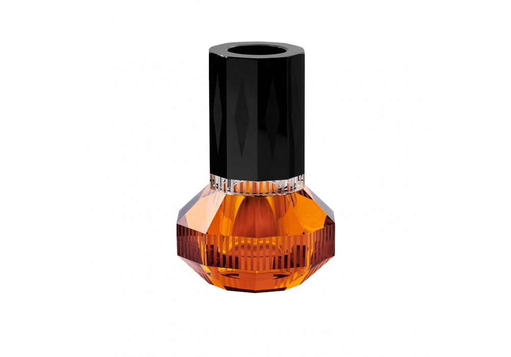 Chicago producido y firmado por Reflections Copenhagen es un jarrón de cristal circular estructurado por varios elementos tallados y acabados a mano en negro, transparente y ámbar.