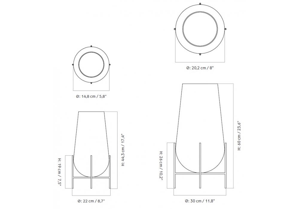 | Dimensiones | • Ø 14,8/22 x H 44,3 cm; • Ø 20,2/30 x H 60 cm |