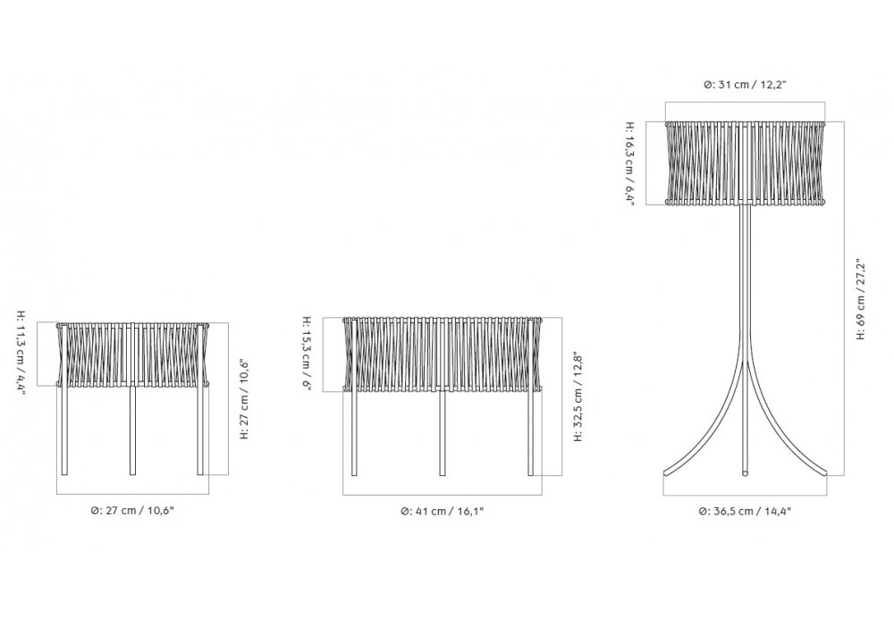 | Dimensiones | • Ø 27 x H 27 cm; • Ø 41 x H 32,5 cm; • Ø 36,5 x H 69 cm |
