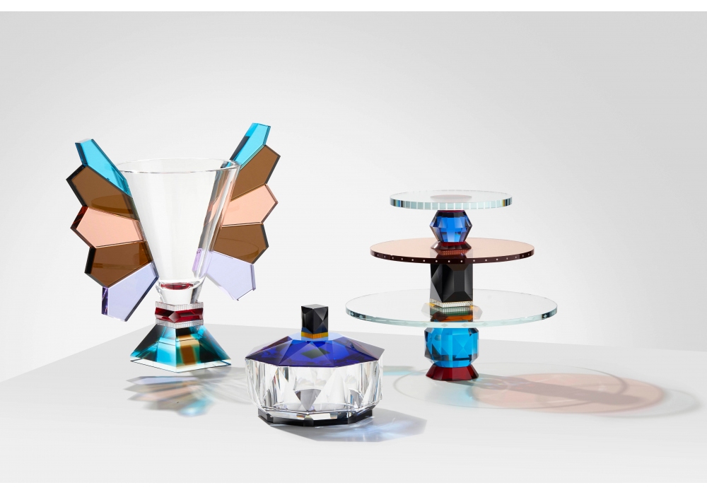 Amarillo producido y firmado por Reflections Copenhagen es un jarrón de cristal en forma de copa estructurado por varios elementos tallados y acabados a mano en transparente, rojo, marrón, azul y morado.