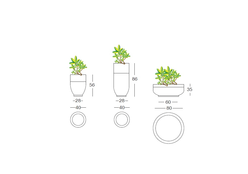 | Dimensiones | Ø 40 x H 56 cm; Ø 40 x H 86 cm; Ø 80 x H 35 cm. |