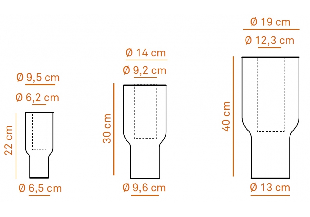 | Dimensiones | • Ø 6,5 x H 22 cm; • Ø 9,6 x H 30 cm; • Ø 13 x H 40 cm |