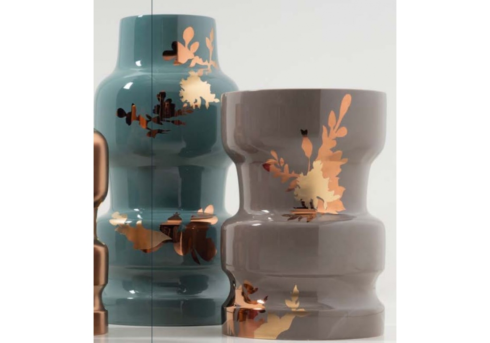...Issima! Decor diseñado por Sam Baron para Bosa es un jarrón en cerámica vidriada decorado con motivos florales acabados en metal precioso. Disponible en 3 tamaños en tonos: gris, verde y morado.