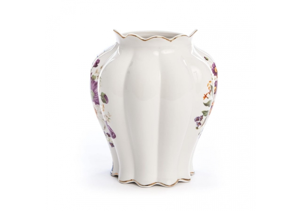 Hybrid Melania diseñado por CTRLZAK para Seletti es un jarrón de porcelana blanca creado combinando dos formas opuestas. La superficie está decorada con diversas figuras florales y pigmentos.