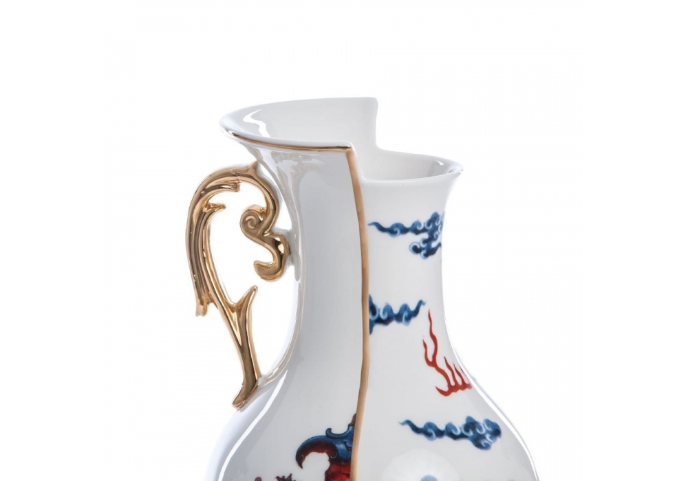 Hybrid Adelma diseñado por CTRLZAK para Seletti es un jarrón de porcelana blanca y dorada creado combinando dos formas opuestas. La superficie está decorada con diversas figuras y pigmentos.