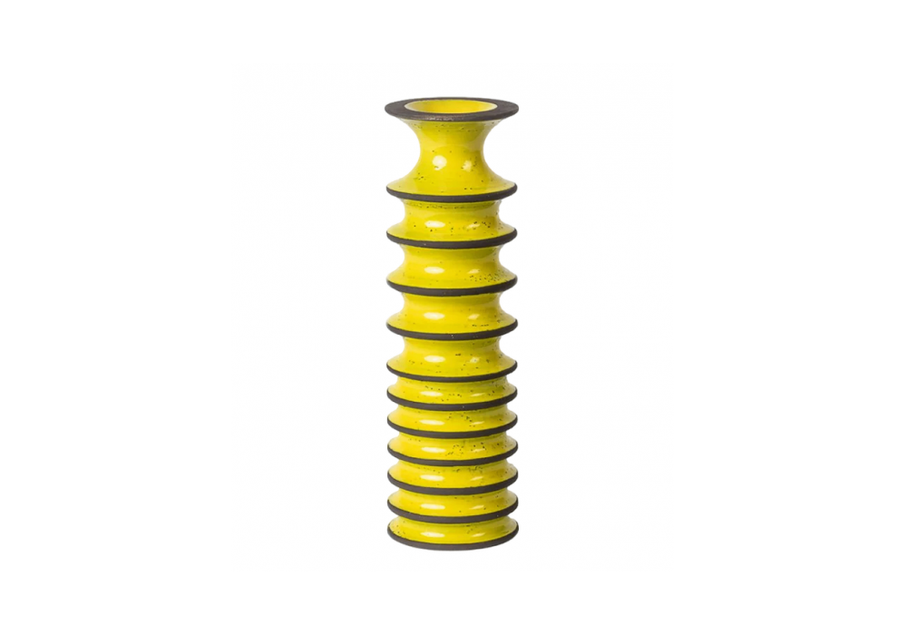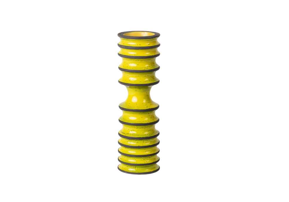 Revolver diseñado por Christoph Radl para Bitossi Ceramiche es un jarrón de arcilla blanca fundida. Pintado en amarillo o naranja cristalino sobre engobe marrón, un color a base de arcilla que se extiende sobre la superficie de cerámica aún cruda. Tiene una superficie rugosa dada por la presencia de granos de arena en el interior del engobe. Disponible en diferentes modelos.