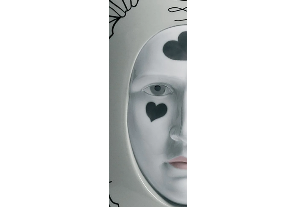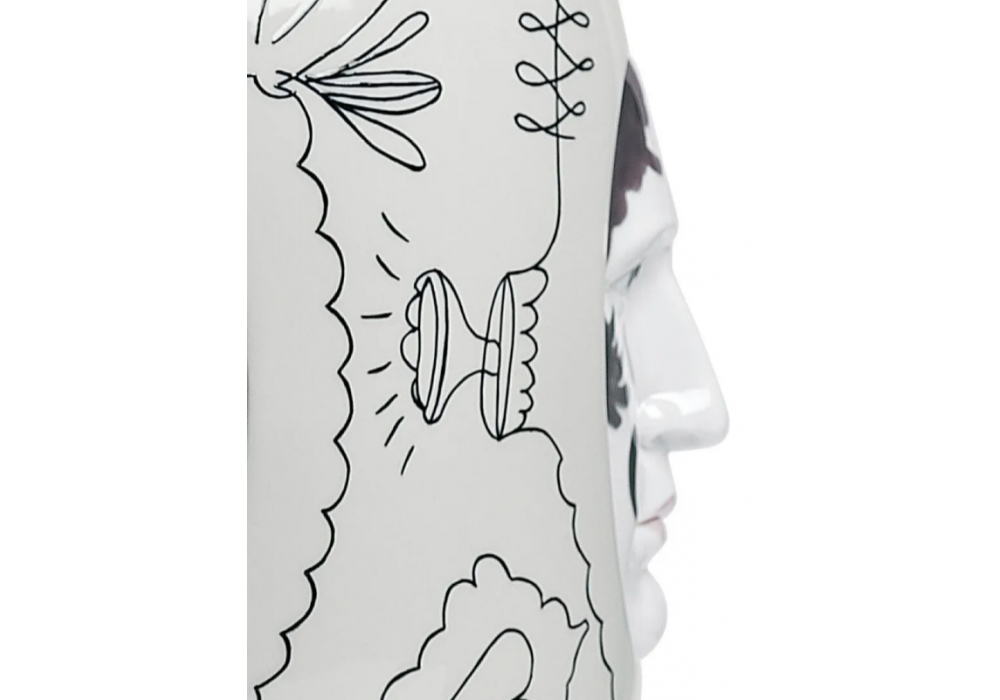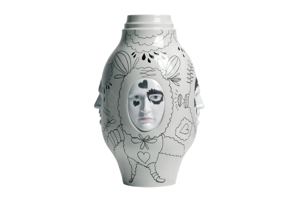 Conversation Vase II firmado por Jaime Hayon y esculpido por Marco Antonio Noguerón para Lladró es un jarrón realizado en porcelana con acabado brillante y decoraciones predominantemente grises y negras.
