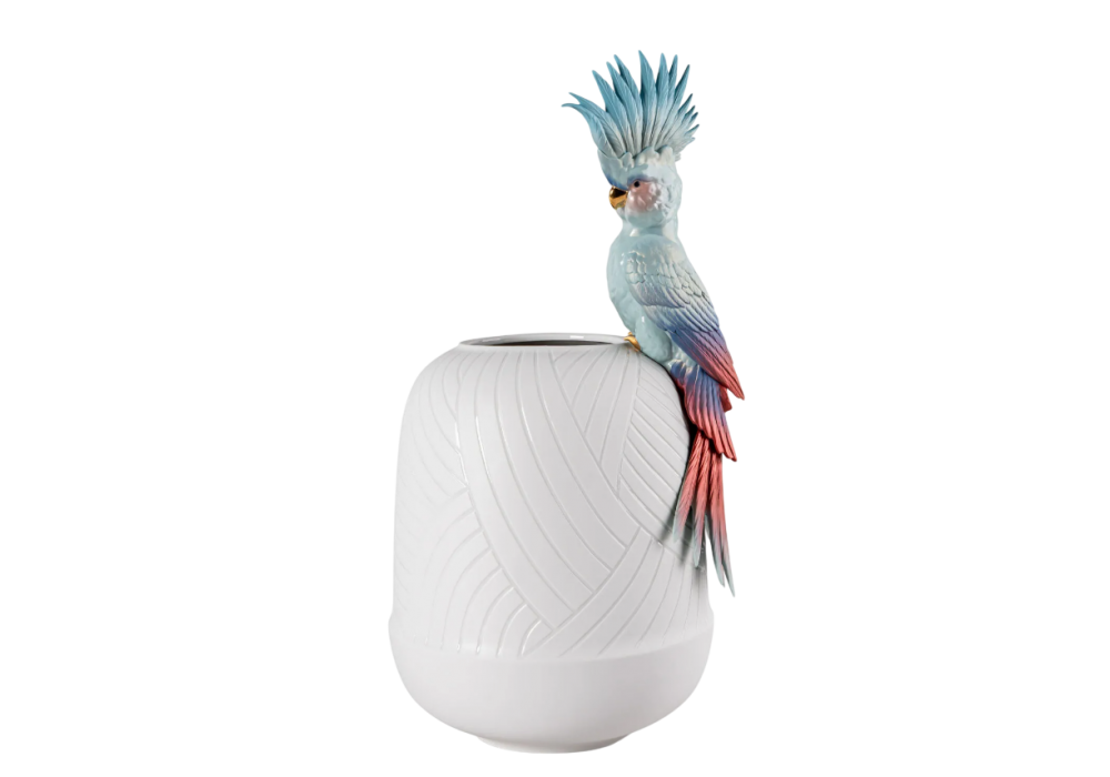 Cockatoo diseñado por José Santaeulalia para Lladró es un jarrón de porcelana blanca con motivos geométricos y decorado con una cacatúa tridimensional en tonos azules y rojos.