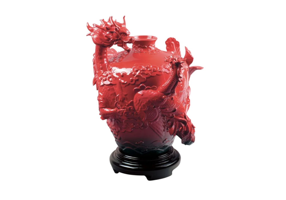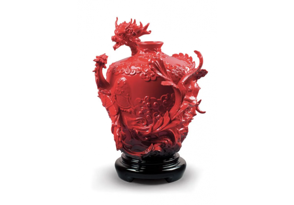 Dragon and Phoenix firmado por el Departamento de Diseño y Decoración para Lladró es un jarrón de porcelana roja brillante sobre base negra con un dragón y un fénix. El plumaje del ave y la piel del dragón están en relieve.