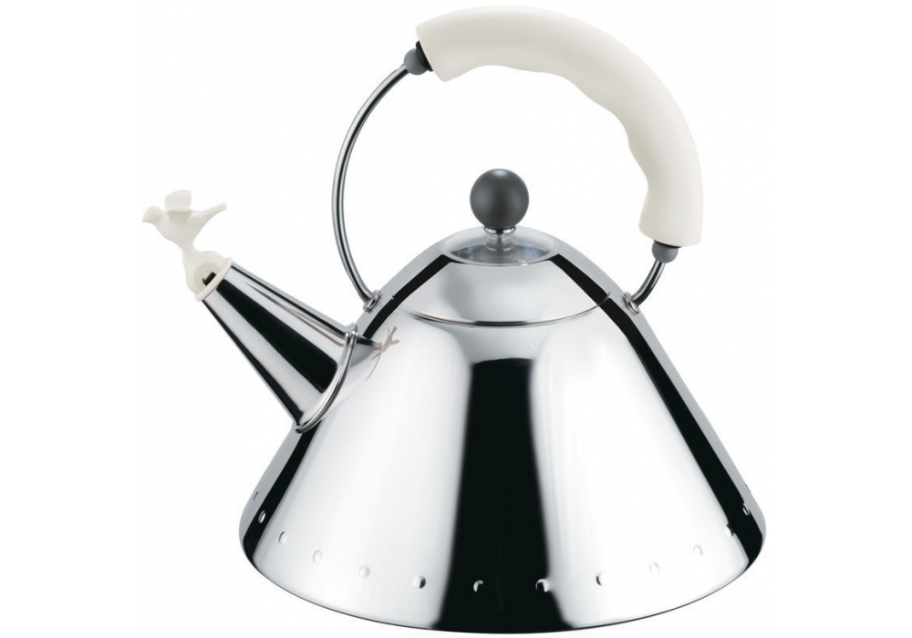 9093 diseñado por Michael Graves para Alessi es un hervidor en acero inox 18/10 brillante con mango y chiflete en forma de pajarito en PA, disponible en 3 colores. Fondo en acero magnético para la cocción por inducción.