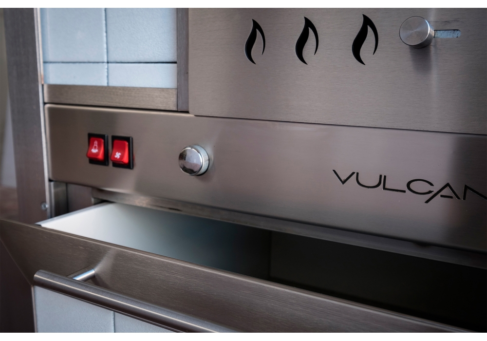 La cámara de cocción está fabricada en acero inoxidable AISI 304 en 2 niveles, equipada con ventilación e iluminación. Manijas de acero inoxidable cepillado con detalles de madera y cierre de presión. Cajón de ceniza ajustable con entrada de aire ajustable. Calentador de agua con puerta de la hoja. Catania es un revestimiento de la Colección Sicilia.