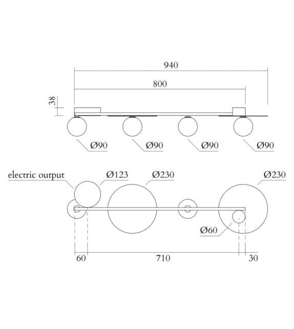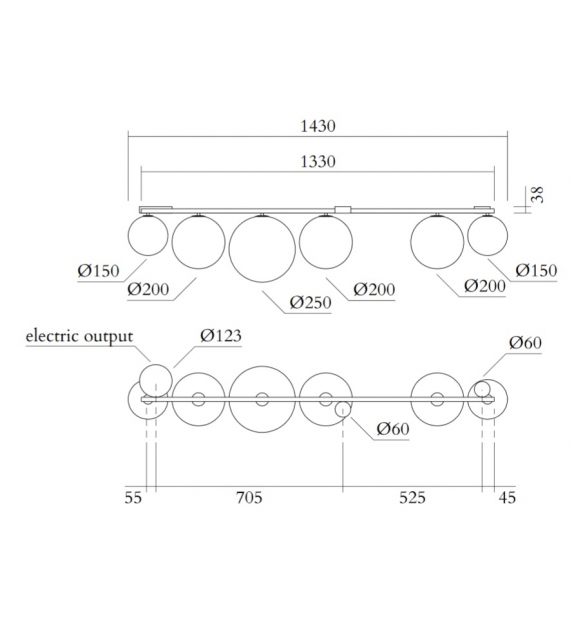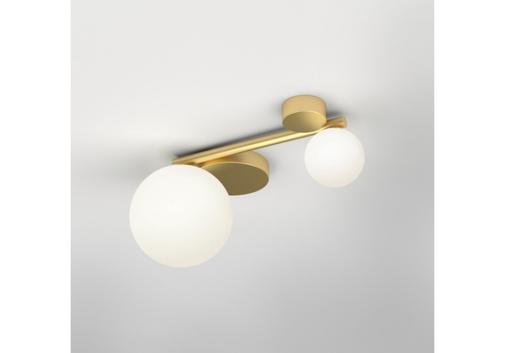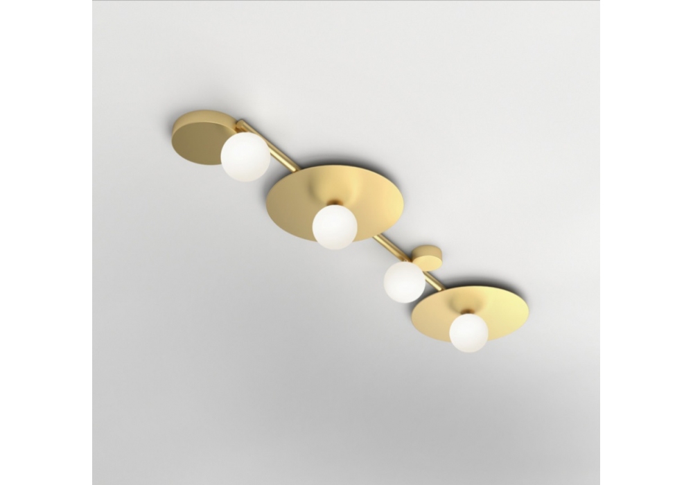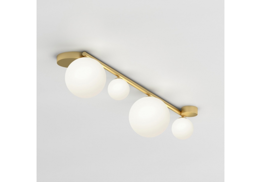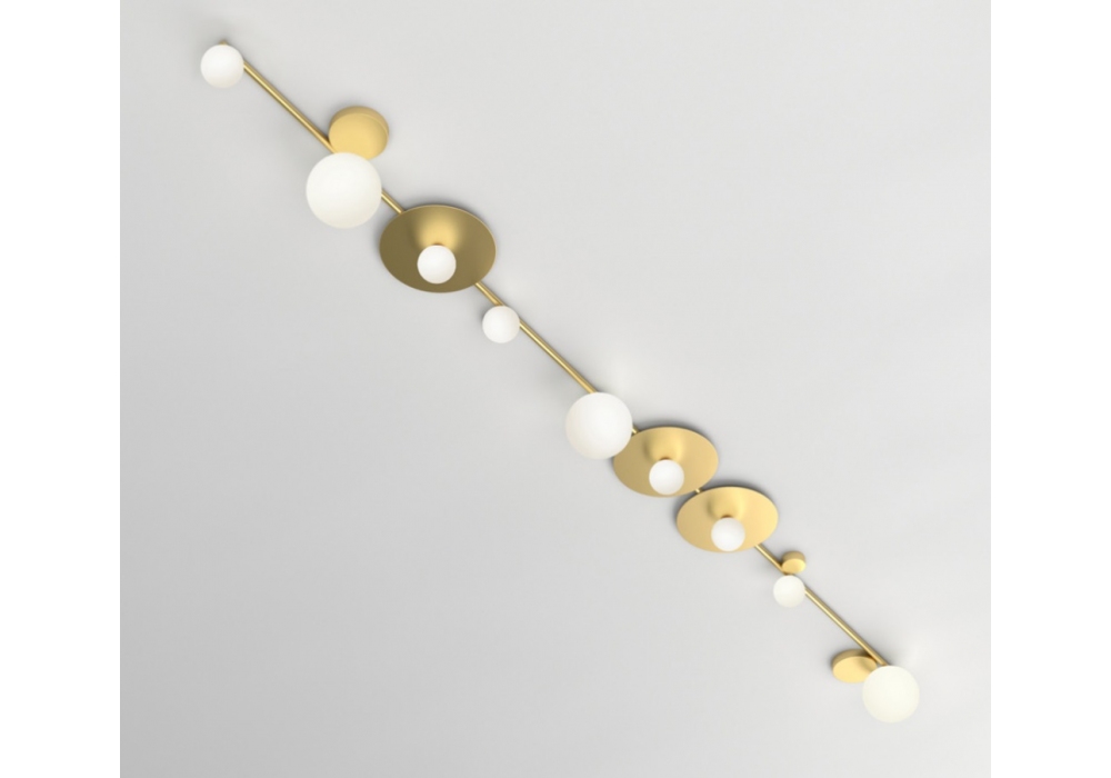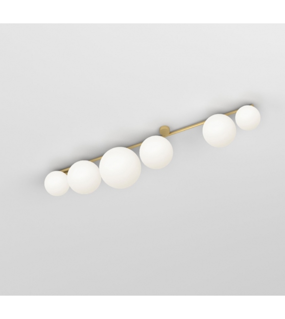 Line Globes diseñada por Atelier Areti es una lámpara de techo realizada en latón cepillado y esferas de cristal blanco. Disponible en diferentes modelos.