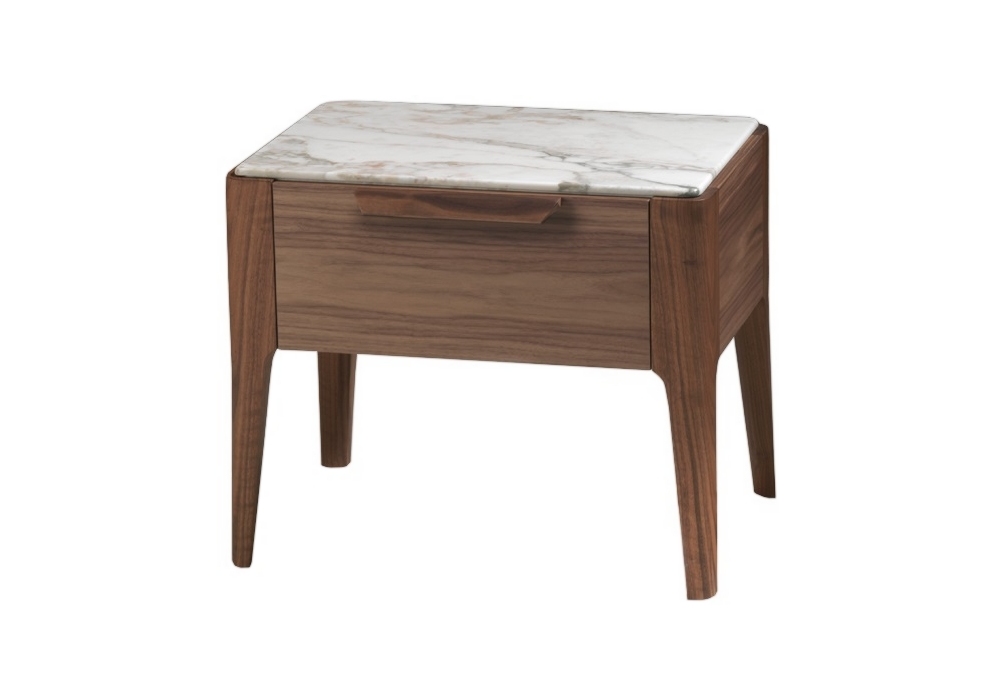 Ziggy Night 1 diseñada por Carlo Ballabio para Porada es una mesita de noche contemporánea que combina una estructura de madera Canaletta con un lujoso sobre de mármol blanco Calacatta oro.