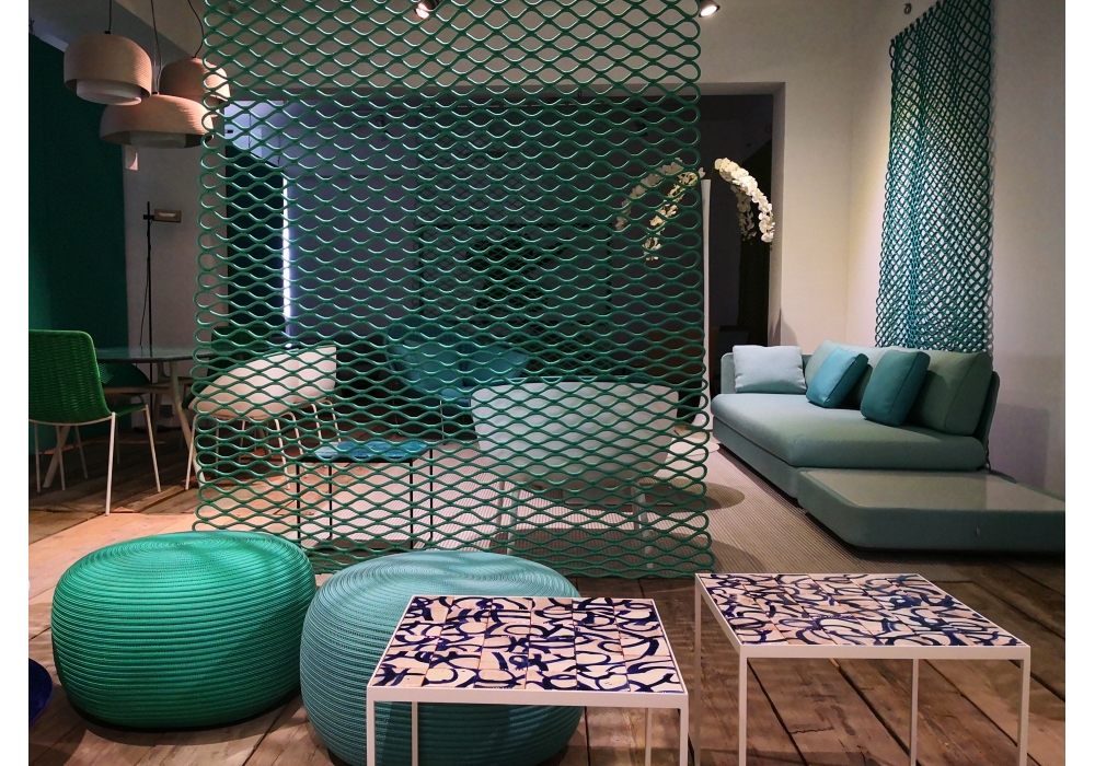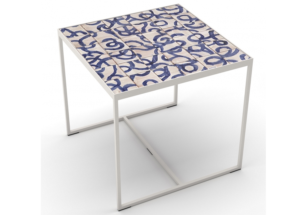 Cocci diseñada por Marella Ferrera para Paola Lenti es una mesa auxiliar con tablero de elementos de loza de acuarela y estructura de acero inoxidable barnizado en polvo en color gris oscuro.