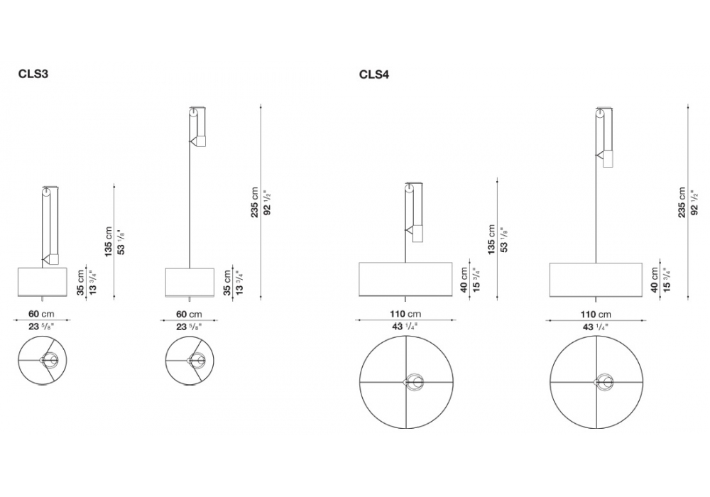 | Dimensiones | Ø 60 cm x H 35-135 cm - Hmax 235 cm; Ø 110 cm x H 40-135 cm - Hmax 235 cm. |
