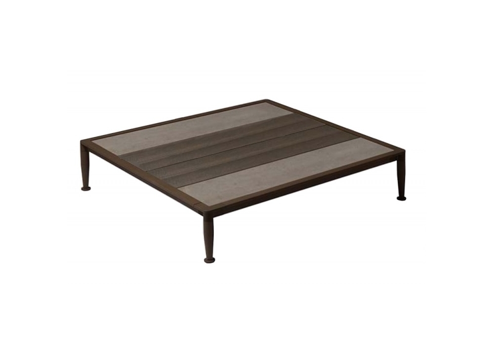 Gea diseñada por Chi Wing Lo para Giorgetti es una mesita para exteriores con estructura en acero inoxidable pintado en polvo carob. Tapa con listones en fresno abonos, afrormosia y mármol cepillado grigio oriente, configurable según lo deseado.