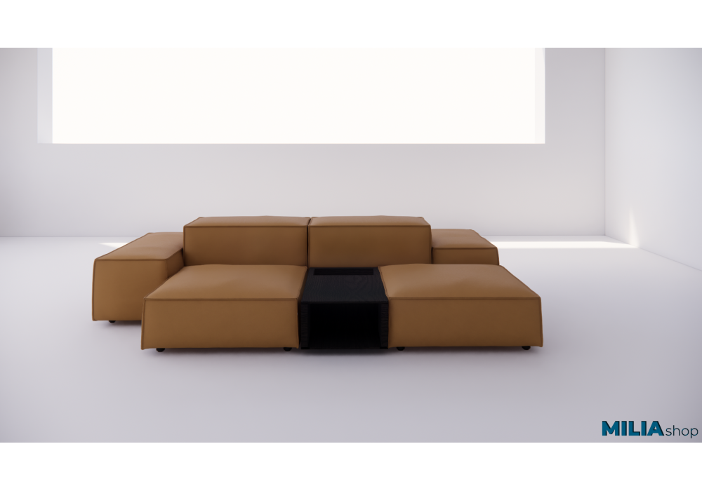 Extrasoft diseñado por Piero Lissoni para Living Divani es un sofá modular realizado con revestimiento en piel color galleta. Mesa auxiliar realizada en madera, acabado roble teñido carbón. Cojines decorativos disponibles en diferentes medidas y revestimientos.