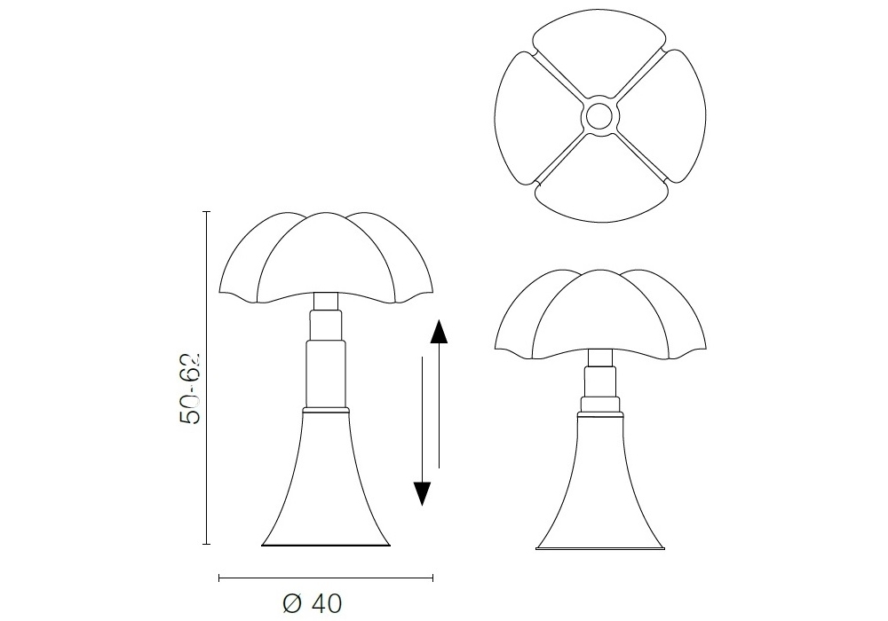 Pipistrello Medio diseñada por Gae Aulenti para Martinelli Luce es una lámpara de mesa regulable en altura con estructura en acero inoxidable satinado, difusor en metacrilato opal blanco, base y pomo en aluminio pintado.