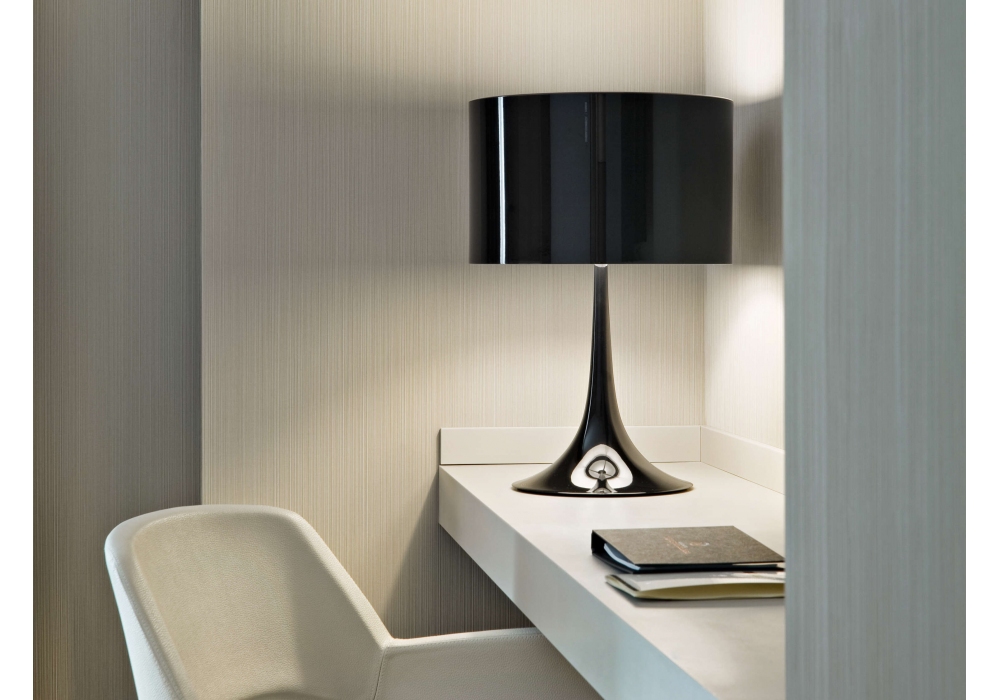 Spun Light T1 diseñada por Sebastian Wrong para Flos es una lámpara de mesa compuesta por cuerpo y difusor en metal torneado, brazos portadifusor y soporte portalámparas en aleación de aluminio fundido a presión, todo pintado al líquido. Los soportes del difusor son de policarbonato blanco estampado por inyección. Difusor superior de cristal prensado con acabado arenado. En el cable hay un dimmer electrónico que permite regular la intensidad de la luz por pasos.