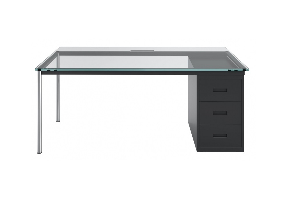 10 Bureau de la Semaine à Paris diseñado por Le Corbusier, Pierre Jeanneret, Charlotte Perriand para Cassina es un escritorio realizado con superficie de vidrio flotado, patas cromadas y estructura pintada. Cajonera con 3 cajones y compartimento técnico, lista para cableado, en acero pintado antracita.