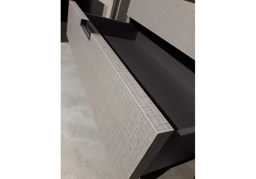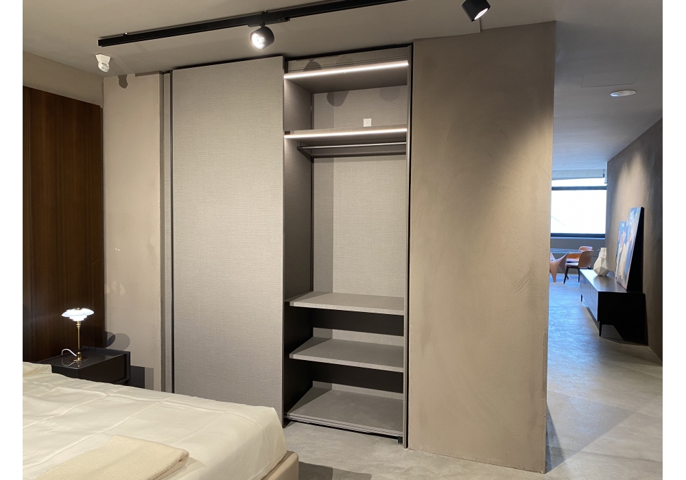Gliss Master-A Filo diseñado por Vincent Van Duysen para Molteni&C es un armario realizado con estructura, cómoda interna y estantes en melamina Tatami gris. Iluminación led.