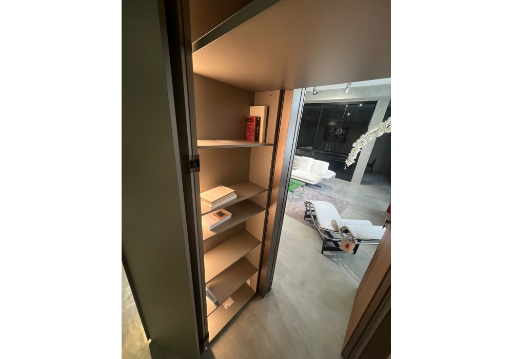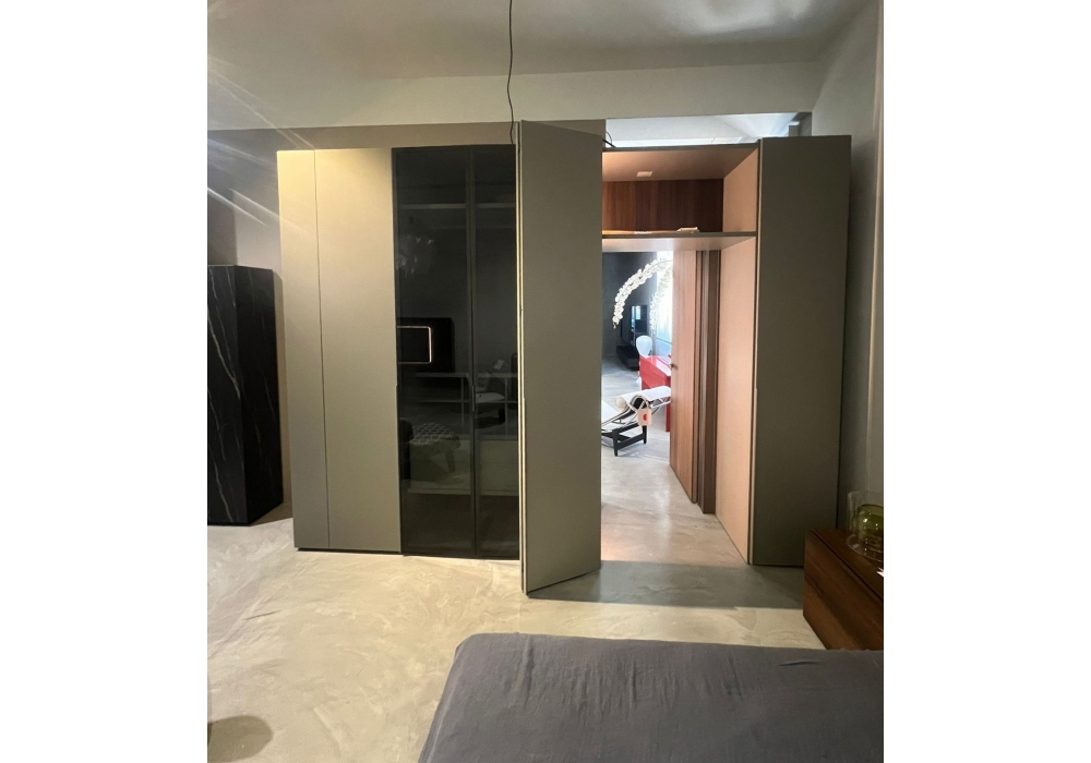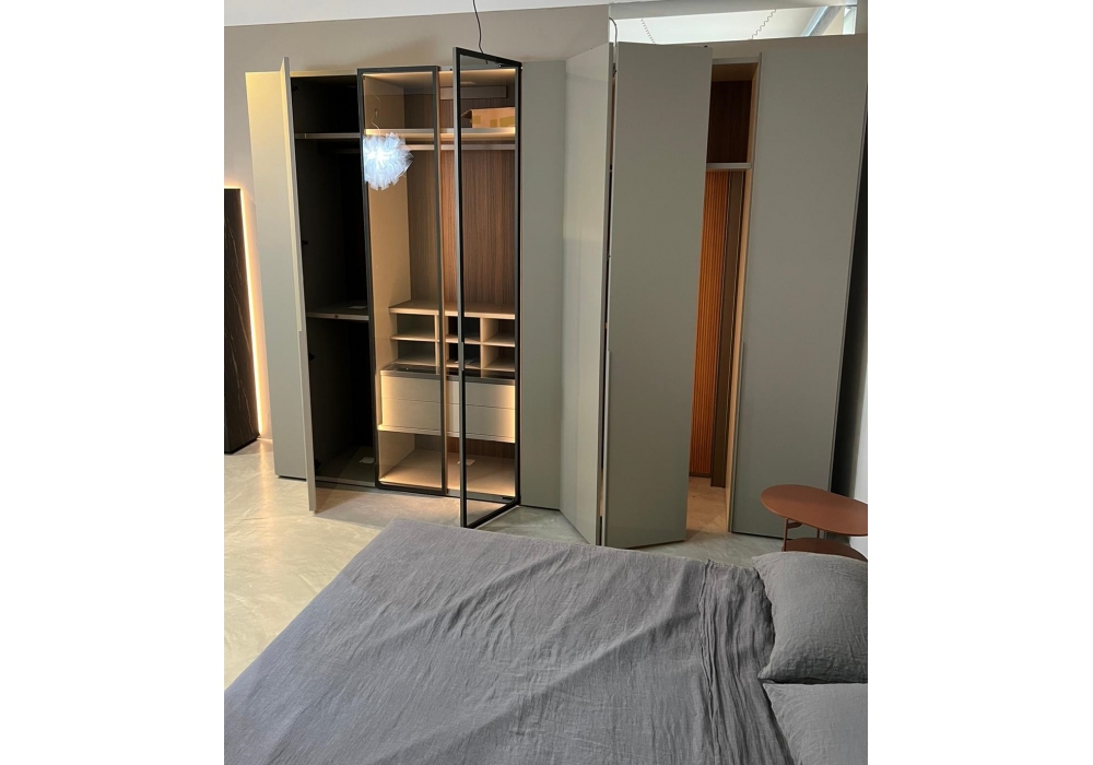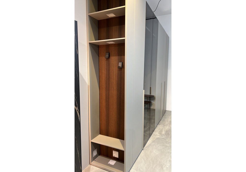 Core diseñado por Caccato es un vestidor realizado con frentes lacados humo mate, traseras en madera de Eucalipto, puertas de vidrio ahumado y perfiles y tiradores de titanio bruñido. Cajonera interior con tapa de cristal con dos cajones y compartimentos con tapicería de piel. Iluminación LED con sensores. Incluye puerta con compartimento de paso.