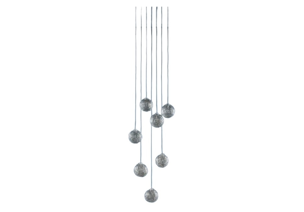Sweet Light Chandelier diseñada por Enzo Catellani para Catellani&Smith es una lámpara de suspensión con base de metal satinado y esferas de alambre de aluminio.