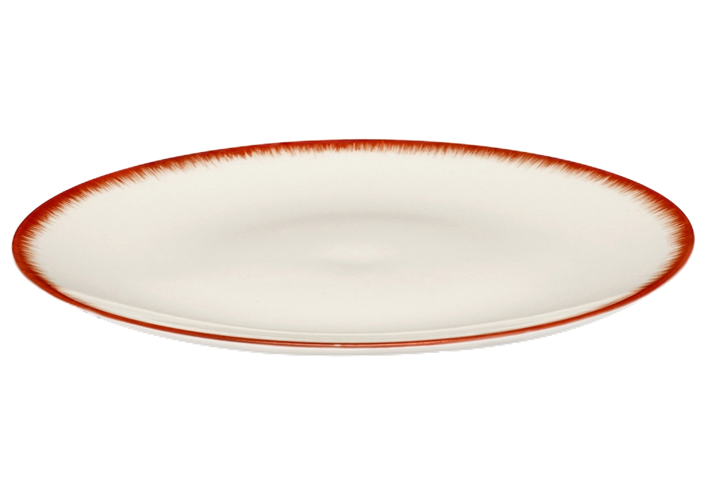 Plate dé Off diseñado por Ann Demeulemeester para Serax es un plato circular en porcelana con borde rojo.