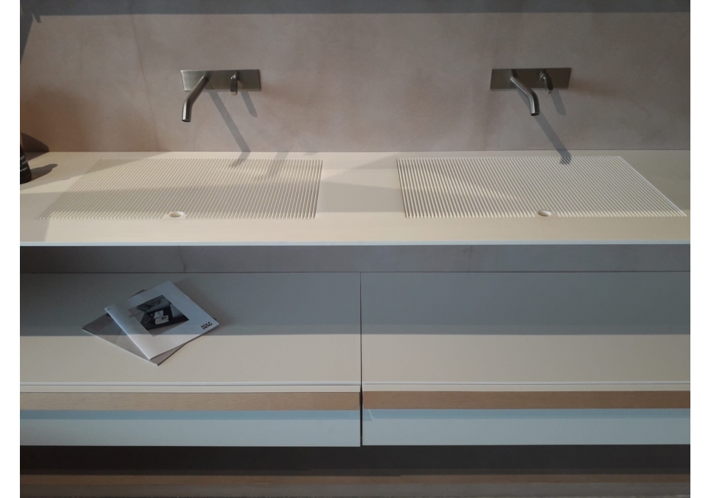 Sistema de Baño Agape compuesto por una encimera autoportante de Corian® Glacier White con lavabos encastrados y dos grifería monomando de pared de acero inoxidable encastrable con joystick monomando y caño horizontal. Los contenedores a continuación están fabricados con estructura lacada en blanco y tirador de roble natural. Espejo con aletas laterales incluido.