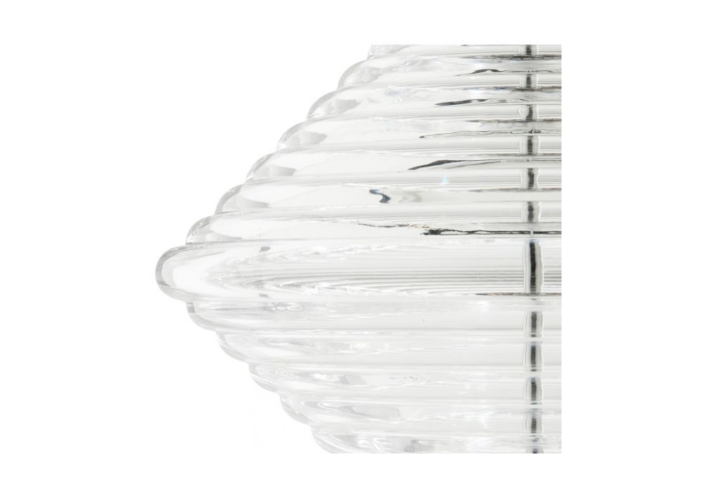 Press Cone diseñada por Tom Dixon es una lámpara de suspensión fabricada en vidrio grueso y transparente con detalle de superficie lineal redondeada.