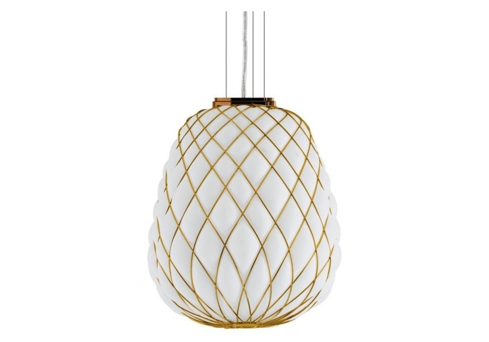 Pinecone diseñada por Paola Navone para Fontana Arte es una lámpara de suspensión con difusor de vidrio blanco opalino. Jaula de metal chapado oro. Cable de alimentación transparente. Cables de suspensión de acero.