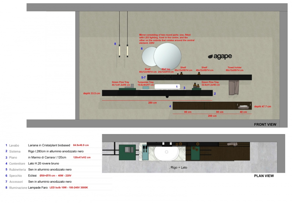 Rigo diseñado por Patricia Urquiola para Agape es un sistema de baño realizado con estructura de aluminio anodizado negro, encimera de mármol de Carrara, lavabo de cristalplant blanco y bandejas de madera para objetos. Completan la composición el espejo Eclissi y las lámparas colgantes Faro.