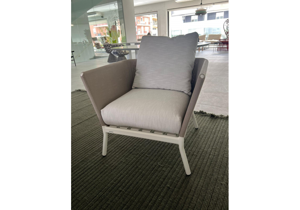 Calla diseñada por Roda Studio es una butaca con estructura de aluminio pintado en polvo y carcasa en cuerda batyline. Cojines de respaldo y asiento tapizados en tejido.