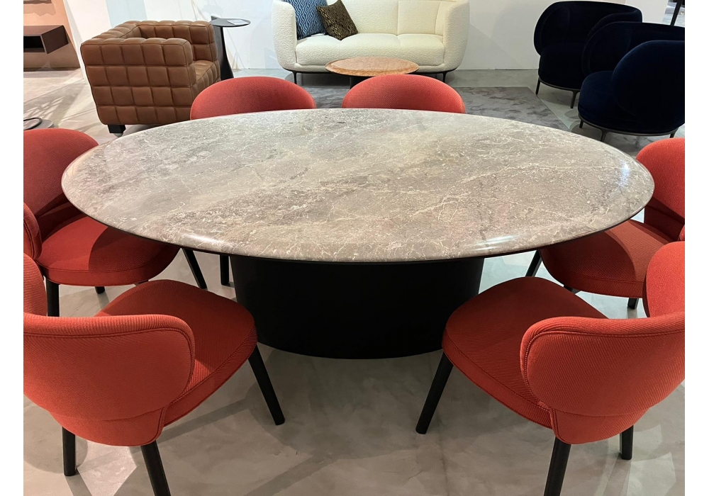 Antilles Dining diseñada por Wittmann y Nichetto para Wittmann es una mesa con tapa de mármol y base revestida en cuero negro.
