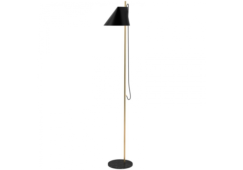 Yuh diseñada por GamFratesi para Louis Poulsen es una lámpara de pie con base circular de mármol negro y tija vertical en latón cepillado. El difusor es de aluminio fundido a presión pintado y apantalla una fuente de luz LED regulable alimentada por un cable de plástico.