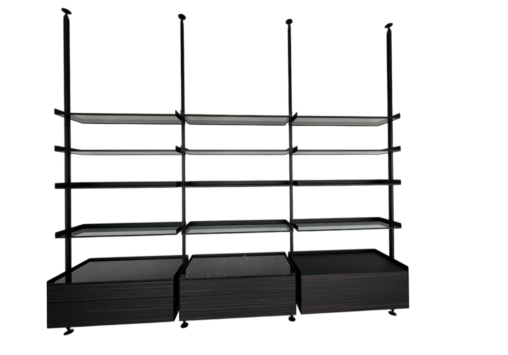 Zenit diseñada por Giuseppe Bavuso para Rimadesio es una librería de pared realizada con estructura negra, contenedores con cajones Tinto Ebano Taiga, tapa en mármol Marquiña negro brillo y cuatro manteles individuales en símil piel acabado 159 Etna.