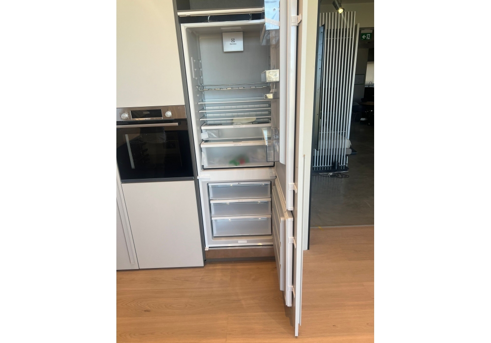 Sign diseñada por Ernestomeda es una cocina moderna realizada con bases Canyon Canneté, encimera Abitum, muebles altos de cristal reflectante transparente y columnas HiMelamin gris seda con tirador Trace.