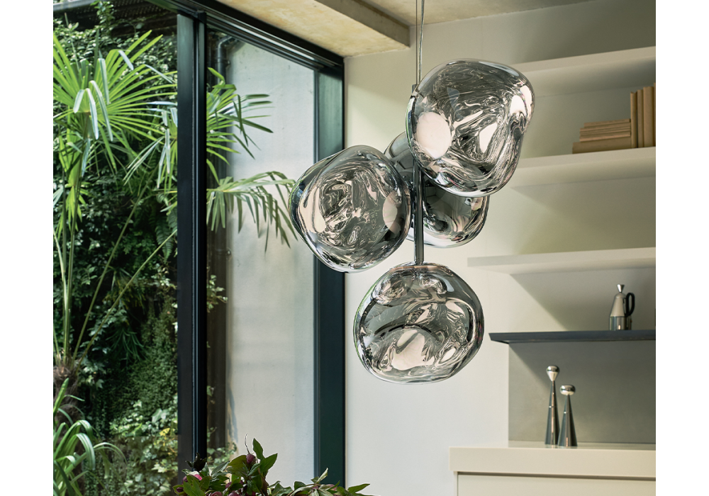 Melt Mini diseñado por Tom Dixon es un candelabro con cuatro difusores con acabado plateado.