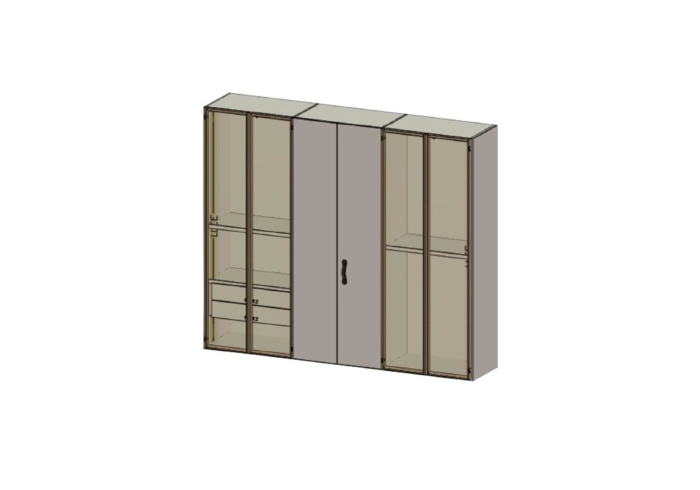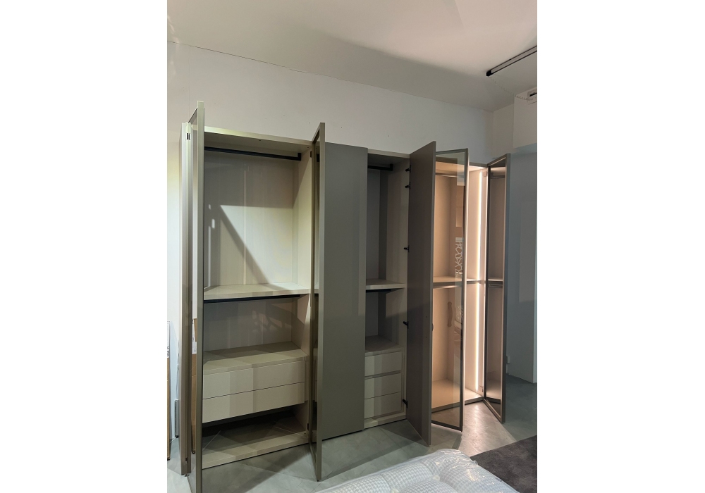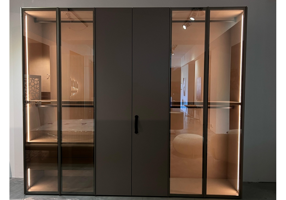 El armario Milano-Plana de Pianca combina elegancia y practicidad con un acabado exterior en Materico Ecru, interior y estantes en Materico Bon Ton. Equipado con accesorios de manganeso, estructura Palladio y puertas en vidrio bronce reflectante, está enriquecido con iluminación LED. Los tiradores C25 Cuoio Moro completan el diseño, con un estante adicional sin luz para mayor funcionalidad.