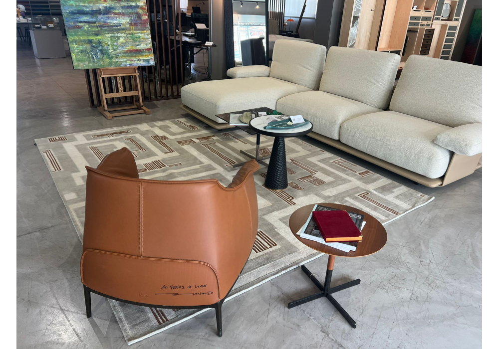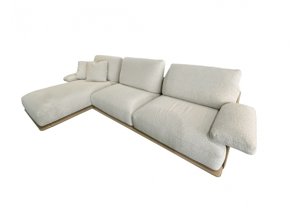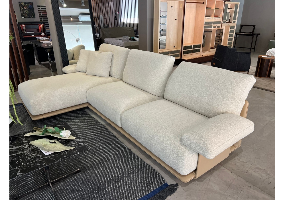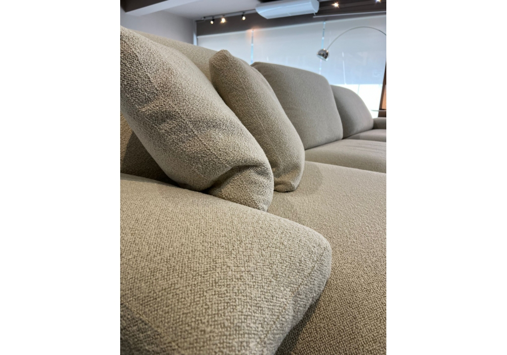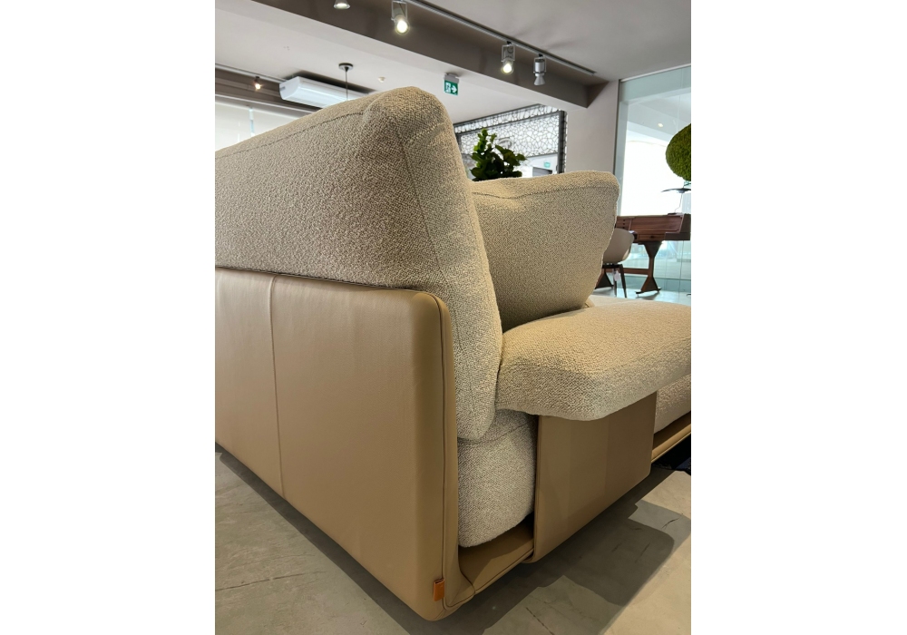 Blisscape diseñado por Ludovica y Roberto Palomba para Poltrona Frau es un sofá modular tapizado en cuero, con cojines de asiento "Soft Comfort" y forro de guata de poliéster y poliuretanos de diferentes densidades con viscoelástica. Cojines tapizados en tela Loop en color Greggio.