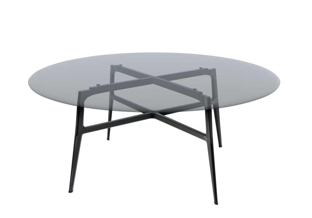Francis diseñada por Giuseppe Bavuso para Rimadesio es una mesa redonda realizada con tablero de cristal gris y estructura de aluminio negro.