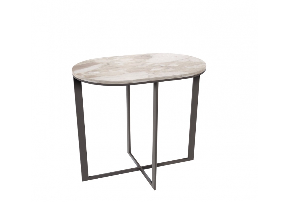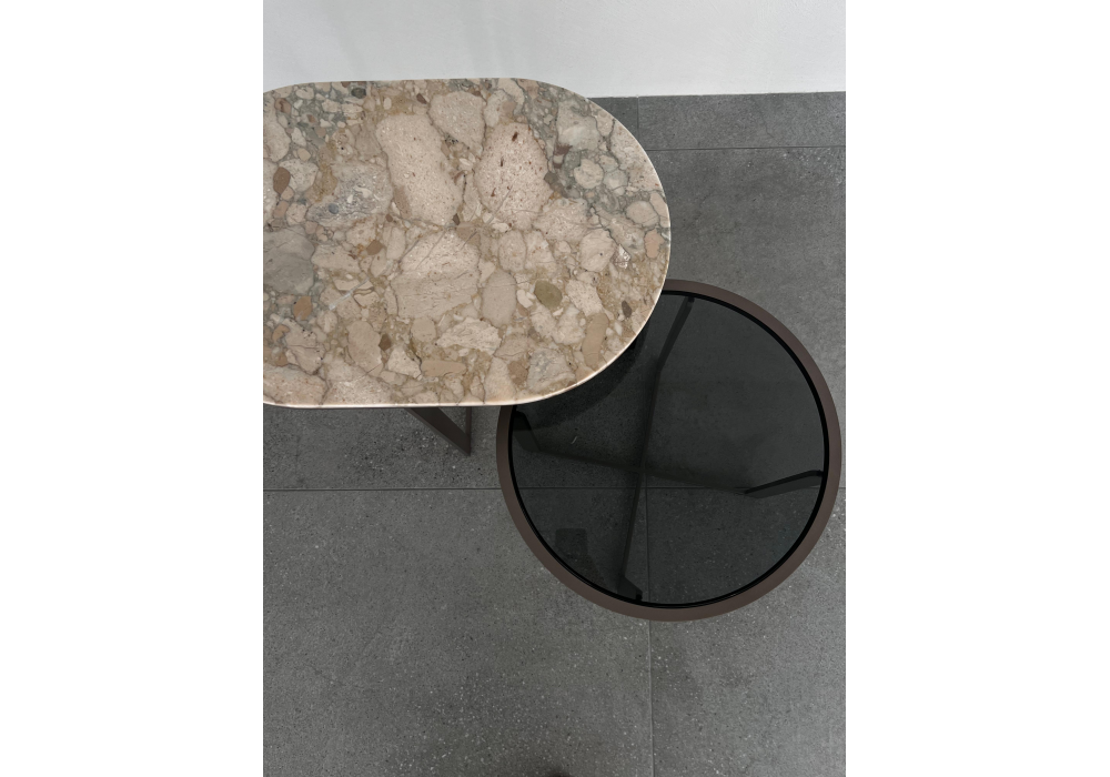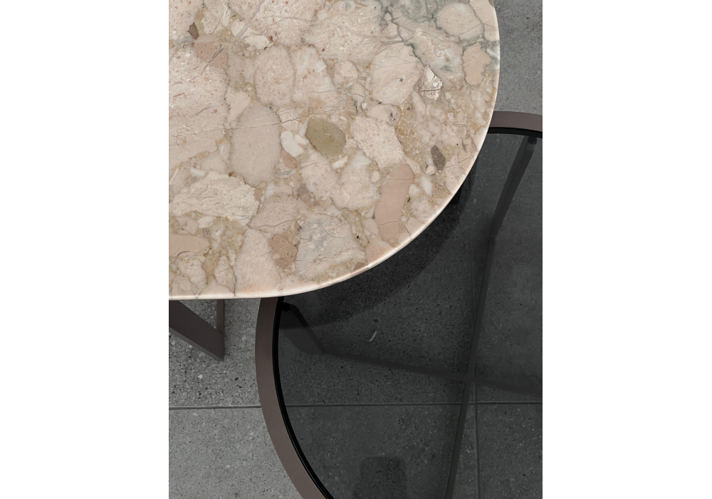 Rialto diseñada por Giuseppe Bavuso para Rimadesio es una mesita con estructura de metal. Disponible con tablero de mármol o cristal.