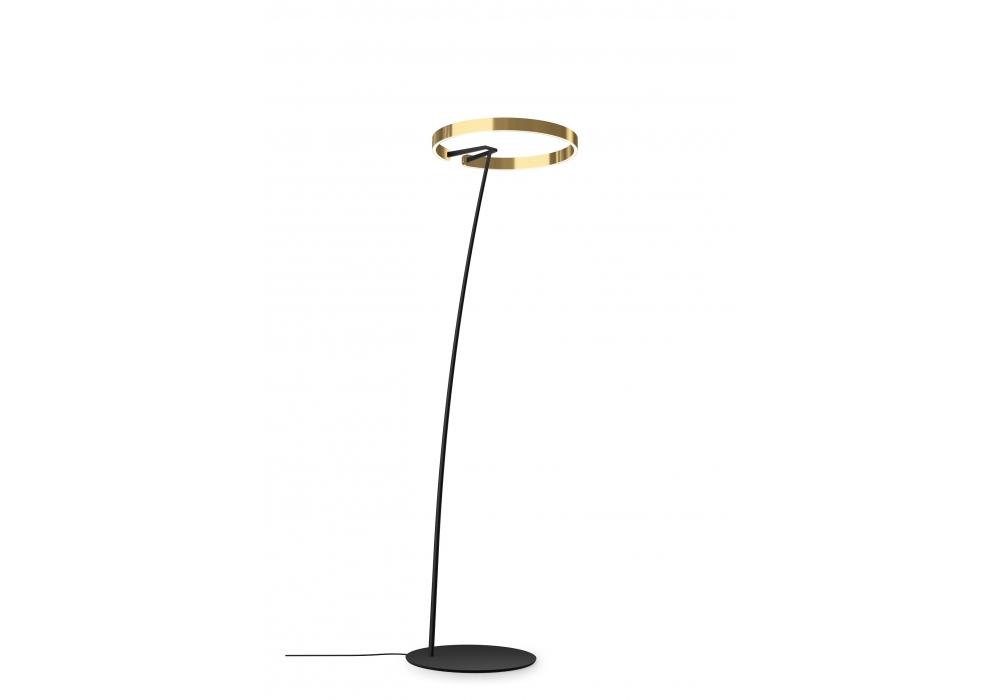 Mito Raggio diseñada por Occhio es una lámpara de pie LED realizada con difusor en aluminio pintado y revestido en PVD y silicona óptica, cuerpo pintado en carbono y base en acero pintado. Desvanecen hacia arriba y hacia abajo.