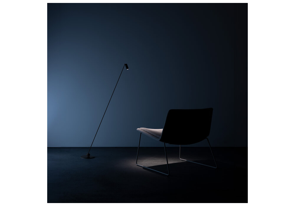 Mia diseñada por Davide Groppi es una lámpara de pie/mesa con un cuerpo inclinable y un pequeño cabezal orientable. Incluye regulador de intensidad y controlador.