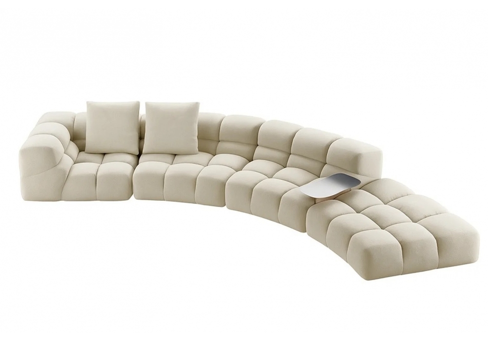 Tufty-Time 20 diseñado por Patricia Urquiola para B&B Italia es un sofá modular realizado con revestimiento de tela, patas en material termoplástico negro y mesita con tapa en aluminio anodizado brillante y estructura en roble claro cepillado.